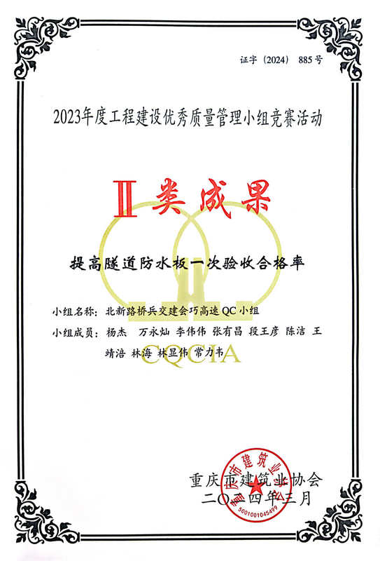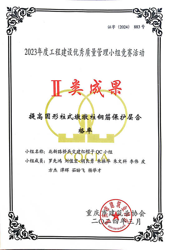 2023年,該公司青年創(chuàng)新攻關小組在公司的大力支持下,自主開展技術創(chuàng)新、體制創(chuàng)效活動,大力提升質(zhì)量管理小組活動成果水平,及時將活動成果運用到公司所屬工程項目中并取得了優(yōu)異的成績。申報10項QC成果全部通過重慶市建筑業(yè)協(xié)會評審。