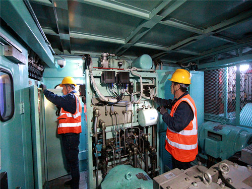 悶熱的機(jī)械間內(nèi),兩人呼喚應(yīng)答、分工明確,配合十分默契。
