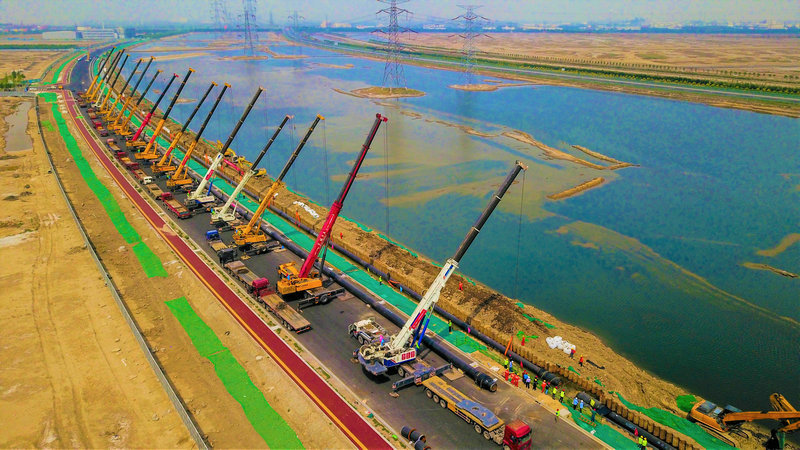 擔負該項目施工的中鐵十八局集團建安公司北疆電廠項目經(jīng)理鞠正平介紹,該項目面臨地下水位偏高、管道下穿高速公路高架橋及人工河道,施工段孤石遍布等困難。項目團隊反復(fù)研討、細致測算、模擬實驗,通過優(yōu)化方案,創(chuàng)新運用沉箱工作井、整體焊接吊裝、大直徑頂管等施工工藝,突破了施工瓶頸。特別是通過16臺100噸到500噸不等噸位的起重機整齊劃一地排成一排,在技術(shù)人員的有序調(diào)度、駕駛員的靈活操作下,吊車準確無誤地將焊接完畢的總長近1600米、重達800噸的四段管線吊裝至既定基坑,確保了管線主干線在既定工期內(nèi)實現(xiàn)貫通。