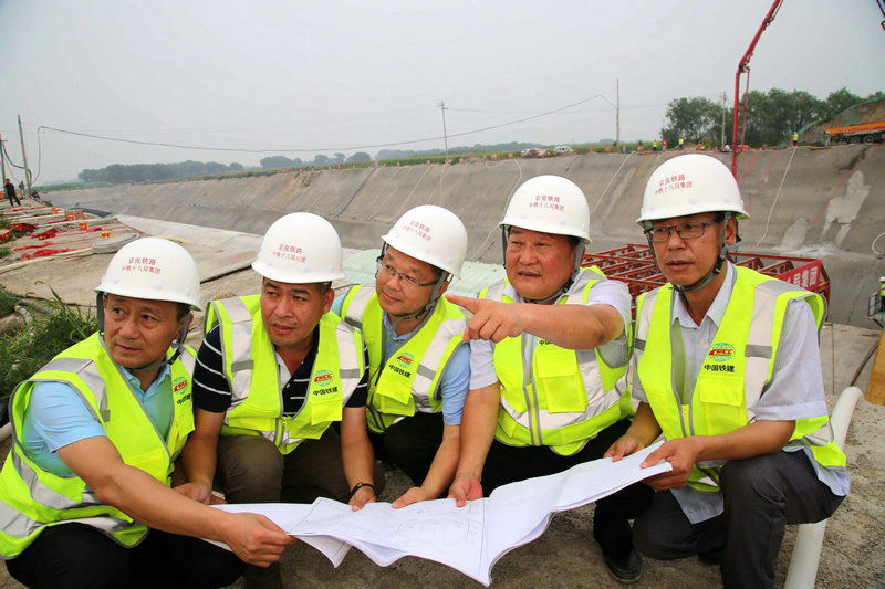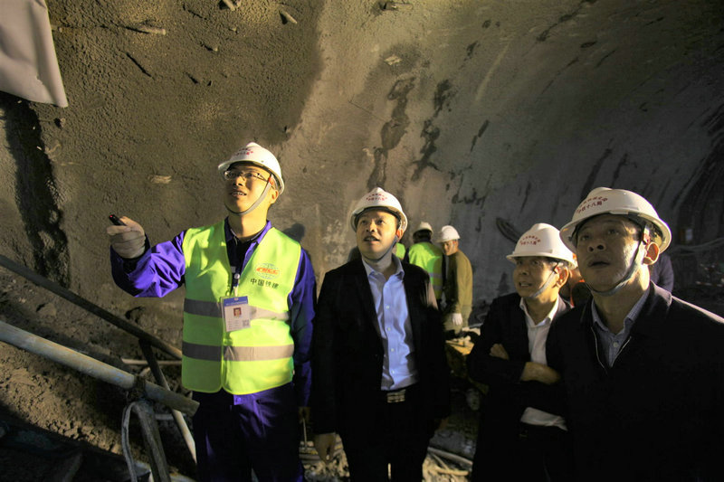 5、中鐵十八局集團(tuán)京張高鐵常務(wù)副經(jīng)理宋庚銀、黨工委書記黃振岐、副經(jīng)理李維宏、四公司執(zhí)行董事長、總經(jīng)理鐘興兵、項(xiàng)目書記張凱等在東花園隧道研究施工方案(伍振 攝)