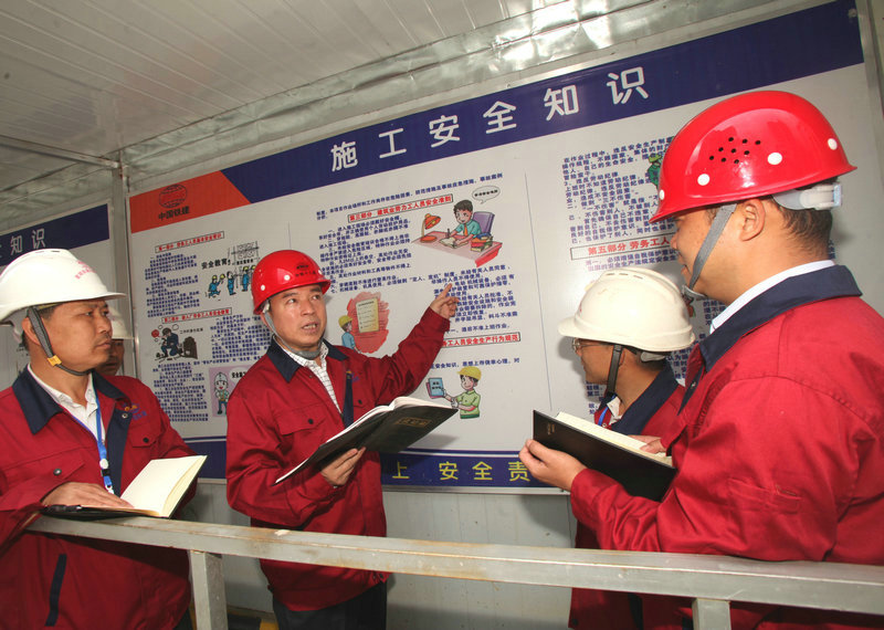 11、中鐵十八局四公司常務(wù)副經(jīng)理兼昆明地鐵6號線項(xiàng)目經(jīng)理李金鎖(左二)、項(xiàng)目書記王彥軍(左一)進(jìn)行安全培訓(xùn) (伍振 攝)
