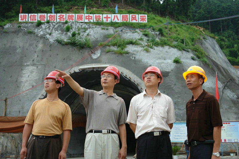 7、中鐵十八局隧道公司執(zhí)行董事、黨委書記何承紅、常務(wù)副總經(jīng)理?xiàng)钗娜A、鄭萬鐵路湖北段項(xiàng)目經(jīng)理付羅靖在現(xiàn)場辦公(伍振 攝)