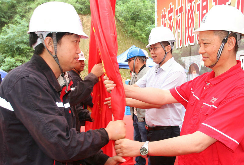 9、中鐵十八局集團(tuán)建安公司黨委書記伍吉勇(右二)在延黃高速公路項(xiàng)目開展的“勞動競賽”活動中為“黨員先鋒隊(duì)”授旗(曾海波 伍振 攝)