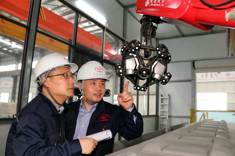 6、中鐵十八局集團(tuán)鄭阜高鐵項(xiàng)目部黨工委書記劉映紅、四公司項(xiàng)目書記許桃元在無砟軌道外形尺寸3D智能檢測系統(tǒng)研究檢測技術(shù)(伍振 攝)
