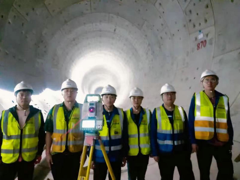 測量隊張有江部長(右2)在TBM盾構(gòu)左線區(qū)間進行測量技術(shù)傳幫帶