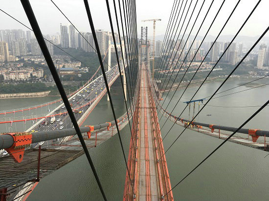重慶鵝公巖軌道專用橋跨越長(zhǎng)江,全長(zhǎng)1650.5米,主橋長(zhǎng)1120米,塔身含臨時(shí)索塔高達(dá)197.28米,主跨600米,屬于雙塔雙索面、五跨鋼箱梁自錨式懸索橋,其跨徑之大為同類型橋梁的世界之最。大橋在柔性體系上將進(jìn)行“先斜拉、后懸索”的施工體系轉(zhuǎn)換,在國(guó)內(nèi)外尚屬首列。大橋已合龍形成斜拉橋體系,后續(xù)在主纜索上安裝索夾、吊桿后,開始“斜拉——懸索”的體系轉(zhuǎn)換施工,最后,按照從上到下的順序拆除16對(duì)斜拉索和臨時(shí)塔柱,實(shí)現(xiàn)懸索橋成橋。