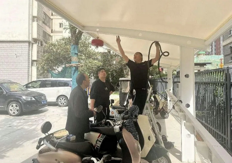 隴海中路11號院 隴海中路11號院新建掃碼充電車棚1處,加裝充電插頭40個,使小區(qū)戶數(shù)與充電設(shè)備比例達(dá)到2:1,從根本上解決了業(yè)主充電難而違規(guī)推電動車入戶的問題。物業(yè)服務(wù)中心在車棚內(nèi)間隔2米安裝了懸掛式溫度感應(yīng)自動滅火器置,為電動車充電區(qū)配備充足可靠的消防安全設(shè)施。
