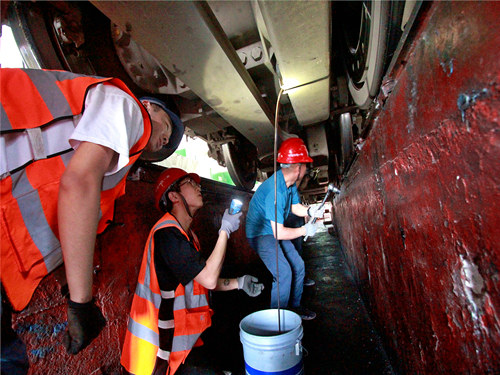 15時36分,大庫地溝內(nèi),負(fù)責(zé)給走行部“治療”的乘務(wù)員王翰與他的搭檔,正合力擰動機(jī)車齒輪箱的螺栓,隨即小心翼翼地放出舊油,期間還不時拿抹布擦拭周邊滴漏的部分。換油的同時,他們還要對機(jī)車輪對及底部部件逐一進(jìn)行檢查,遇到關(guān)鍵部位還要拿出標(biāo)尺進(jìn)行測量,確保磨耗在規(guī)定限度內(nèi)。