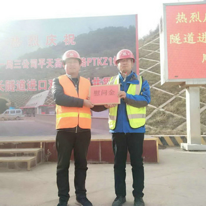 項(xiàng)目常務(wù)副經(jīng)理兼總工程師柳吉煥為施工隊(duì)負(fù)責(zé)人發(fā)放慰問金 為攻克關(guān)山隧道施工難關(guān),在強(qiáng)化組織管理,優(yōu)配施工資源,著力現(xiàn)場(chǎng)安全質(zhì)量管控的同時(shí),大力開展技術(shù)創(chuàng)新,在施工中采用了一系列新技術(shù)、新工藝、新設(shè)備,如采用大管棚配合三臺(tái)階七步法順利下穿304省道、推廣應(yīng)用何廣沂教授研發(fā)的“新型聚能水壓光面爆破新技術(shù)”、邀請(qǐng)公司“創(chuàng)新專家”馬小利成功研發(fā)“小導(dǎo)管縮尖機(jī)”、引進(jìn)防水板自動(dòng)鋪設(shè)臺(tái)車、霧炮養(yǎng)生機(jī)、自行式液壓仰拱棧橋、單臂鑿巖臺(tái)車、單臂濕噴機(jī)等先進(jìn)設(shè)備,克服地質(zhì)復(fù)雜、極端天氣影響、地材短缺等困難,科學(xué)組織,精心施工,為創(chuàng)建平安工地,打造品質(zhì)工程發(fā)揮了重要作用。
