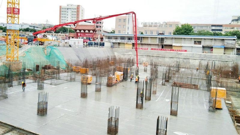 “新建1#農(nóng)產(chǎn)品交易中心為地上4層、地下1層的綜合商業(yè)體,本次共計澆筑C35P8混凝土1140方,澆筑區(qū)域存在大量的單樁、兩樁和三樁承臺及基礎(chǔ)梁,鋼筋含量大,降板區(qū)域多,節(jié)點做法復(fù)雜。”張斌介紹說。為應(yīng)對突發(fā)事件,工程技術(shù)部全力運轉(zhuǎn),研究圖紙,將問題解決在一線,工作部署在一線,經(jīng)驗總結(jié)在一線,以最快效率解決問題。此次底板基礎(chǔ)澆筑完成,是繼深基坑樁基施工、塔吊安裝完成后的又一重要節(jié)點,靜寧項目的建設(shè)者用實際行動踐行了新時代、新?lián)?、新作為,詮釋了鐵建速度和央企擔當。
