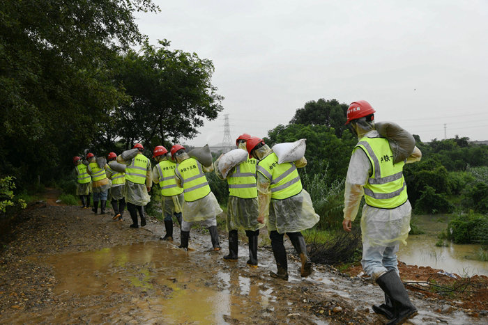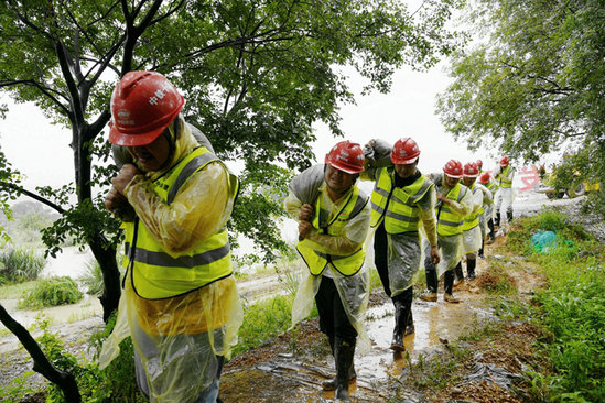 他們分工明確,搶險(xiǎn)救援有條不紊地進(jìn)行。為了古縣畈村群眾的安全,搶險(xiǎn)隊(duì)員忠實(shí)履行央企社會(huì)責(zé)任,在雨水里扛運(yùn)、堆碼,與自卸車、挖掘機(jī)展開人機(jī)接力賽。轉(zhuǎn)運(yùn)沙袋的員工盡管穿著雨衣、半高腰雨鞋,雨水仍然從臉上灌進(jìn)里面,衣服都被澆濕了,雨鞋里灌滿了泥水,在泥濘不堪的小路上來(lái)回穿梭,全然不顧這些,只為了盡快將堤壩筑牢。