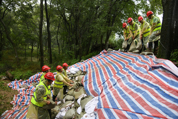 搶險(xiǎn)隊(duì)員雨中扛沙袋 呂奎元攝