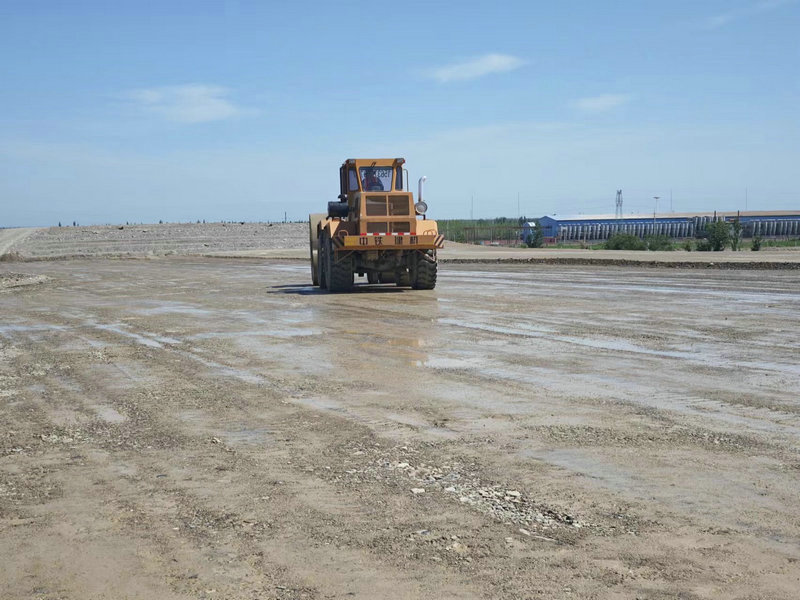 圖為新疆兵團(tuán)建工水電集團(tuán)市政路橋公司第五師雙河市G577沙山子-G219線公路(互通立交工程)主線K8+700-K8+500段沖擊碾夯實(shí)。(王小丫 攝)