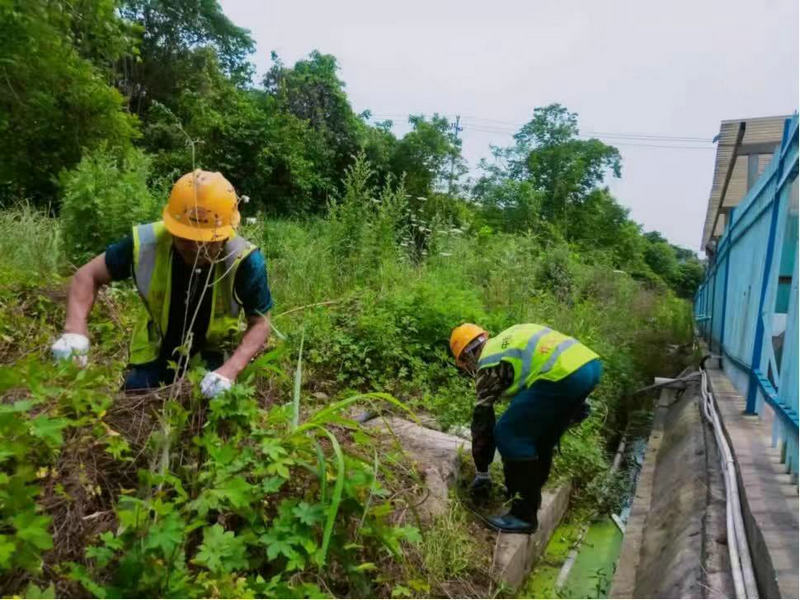 項(xiàng)目部勤雜人員定期對(duì)鄰山排水溝進(jìn)行清淤和除草