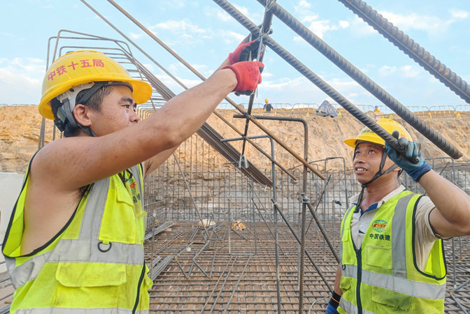 高溫下,員工在綁扎鋼筋 呂奎元攝
