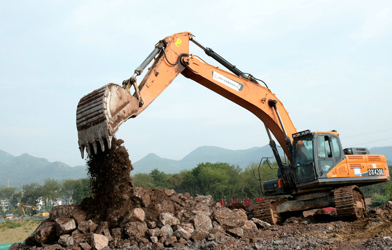 挖掘機(jī)作業(yè) 孫永現(xiàn)攝白虎灘樞紐位于常山縣樊溪村上游200米處,主要工程量為1座電站,15孔14米寬、7米高泄洪閘、應(yīng)急過(guò)船設(shè)施、船閘、主副廠房等。因項(xiàng)目一半建在常山江河道上,必須先進(jìn)行圍堰施工,待圍堰具備抵擋洪水沖擊能力,樞紐各分項(xiàng)工程方可進(jìn)入施工程序。另外,常山江每年4—7月份為每年的主汛期,暴雨和上游20多座水庫(kù)泄洪導(dǎo)致常山江水流暴漲、湍急,最大洪峰水位將升高6—8米,座落在江水中的泄洪閘、船閘等必須停工給洪水讓路,汛期過(guò)后再?gòu)?fù)工,與其它3座樞紐情況一樣。