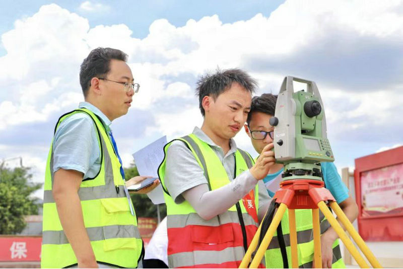 “分兩個小組進(jìn)行,每組二人,互相合作依次考試,設(shè)站點可選擇18JM18和K1兩個點,后視點均使用18JM17??荚嚂r間30分鐘。”隨著監(jiān)考員宣布比賽規(guī)則,該項目部技術(shù)員隨機(jī)組隊,打開全站儀箱子的鎖栓,取出儀器。架設(shè)三角架、擰緊連接螺旋、調(diào)整對點器······汗水從臉頰滑落,目光卻愈加堅定,技術(shù)員們有條不紊,默契配合,爭分奪秒,一場專業(yè)技能的較量拉開序幕。