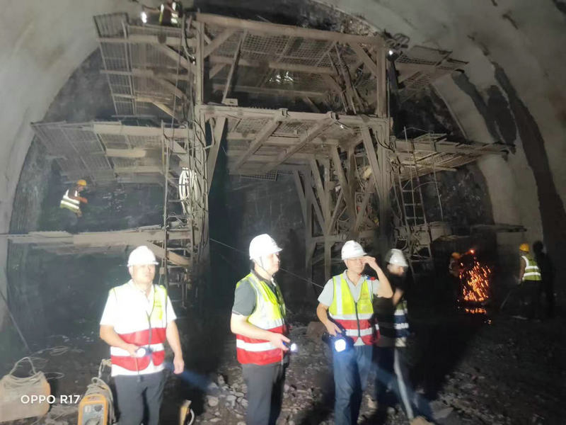項(xiàng)目黨支部書記韓崇生(左二)組織黨員干部在中梁山隧道進(jìn)口掌子面進(jìn)行安全檢查