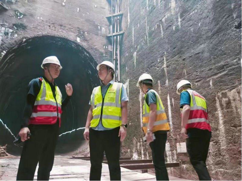 項(xiàng)目安全總監(jiān)高超德(右二)陪同項(xiàng)目部黨政主管領(lǐng)導(dǎo)在中梁山隧道進(jìn)口進(jìn)行安全檢查