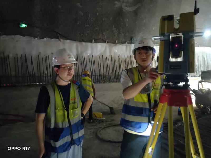 現(xiàn)場(chǎng)技術(shù)副部長李飛(左)與測(cè)量工謝承穩(wěn)(右)聯(lián)合進(jìn)行標(biāo)高復(fù)測(cè)