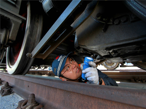 11時05分,經(jīng)過一系列仔細(xì)認(rèn)真的巡檢后,乘務(wù)員高亮也已來到了最后一組機車輪對前。只見他側(cè)臉貼于鋼軌前,手持電筒透過狹小的縫隙對機車電機設(shè)備進(jìn)行查看。經(jīng)過幾次反復(fù)地挪身探照后,他才放心弓身走出了地溝。