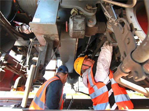 10時10分整,在行修小組帶隊人張思的指揮下,“問診”工作正式開始。按照分工,他們在機車旁、地溝里、操縱間內(nèi)分別對風(fēng)管、暖風(fēng)機、溫控閥、制動管路、柴油機間等處進(jìn)行“手術(shù)”包扎處理。車上車下來回竄跳,遇到刁鉆位置時還要跪在地上進(jìn)行仔細(xì)查驗。庫停時間短,任務(wù)重,不由他們顧及,不一會兒,手套和工服就沾滿了油污。
