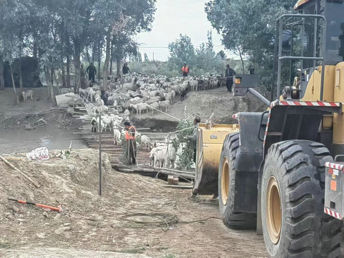 針對現(xiàn)場情況,項目調(diào)配了兩臺裝載機、一輛運輸車、一輛挖掘機調(diào)運土方、填筑河道。項目部青年志愿者們堅守在一線,充分發(fā)揚不畏艱難險阻的精神,不間斷觀察現(xiàn)場情況,實時掌握設(shè)備運行狀態(tài),選擇水流較緩的區(qū)域進(jìn)行吊橋搭設(shè),并對易被破壞風(fēng)險部位時刻關(guān)注,嚴(yán)防吊橋受外力破壞。由于水流湍急,土方無法填筑形成安全通道。持續(xù)到下午17時許,洪水水位下降,救援團隊抓住寶貴時機,迅速安排挖掘機搭設(shè)臨時吊橋1座。隨著吊橋搭建逐漸穩(wěn)固,被困牧民在救援人員的協(xié)助下小心翼翼地帶著羊群來到安全地帶。