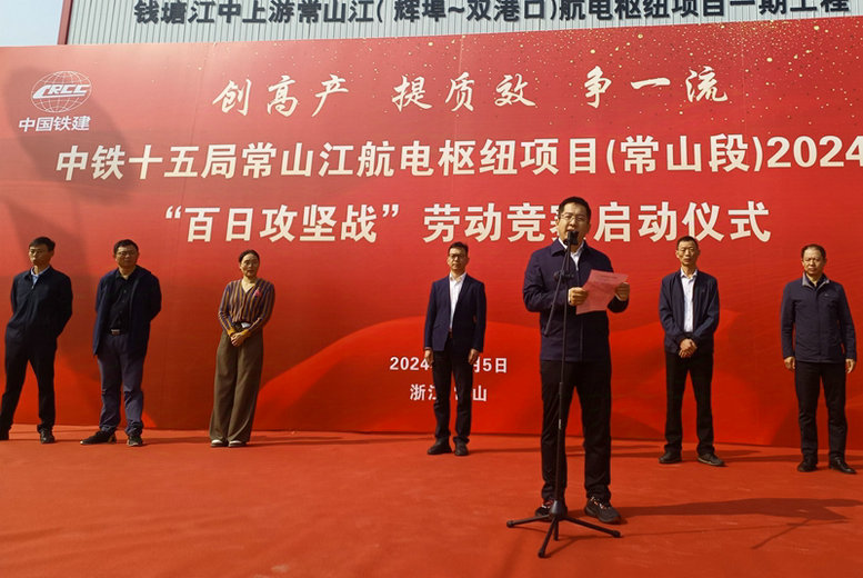 鐵路工程建設(shè)網(wǎng)訊 11月5日上午,中鐵十五局常山江航電樞紐項(xiàng)目部隆重舉行了“百日攻堅(jiān)戰(zhàn)勞動(dòng)競賽”啟動(dòng)儀式,并舉行了揭牌,公司總經(jīng)理、黨委副書記田書廣作動(dòng)員講話,常山縣城投集團(tuán)董事長鄧輝云發(fā)言,公司副總經(jīng)理兼常山江航電樞紐項(xiàng)目黨支部書記、項(xiàng)目負(fù)責(zé)人黃偉主持。
