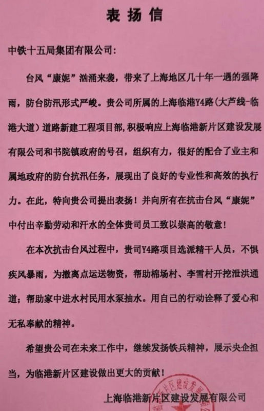 鐵路工程建設(shè)網(wǎng)訊(通訊員 張聰聰)近日,臺風(fēng)“康妮”洶涌來襲,帶來了上海市幾十年難得一遇的強降雨。Y4路項目防臺防汛彰顯央企擔當,收獲了業(yè)主單位的表揚信。信中對該項目全體參建人員在抗擊臺風(fēng)“康妮”中的辛勤付出表達了衷心的感謝。