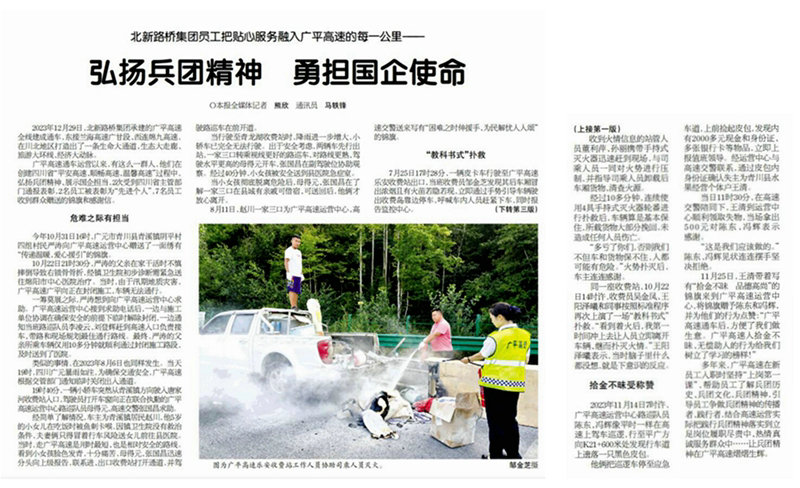 廣元訊(通訊員 馬軼鋒)11月19日,兵團十一師黨委機關報《天山建設報》在一、三版刊載《弘揚兵團精神、勇?lián)鷩笫姑吠ㄓ?,以發(fā)生在廣平高速上的5個貼心服務、助民救民感人事例展現(xiàn)了廣平高速在沿線群眾中的良好“口碑”、北新路橋在履行社會責任中的國企擔當、兵團精神隨路橋延伸的不斷傳播和踐行。