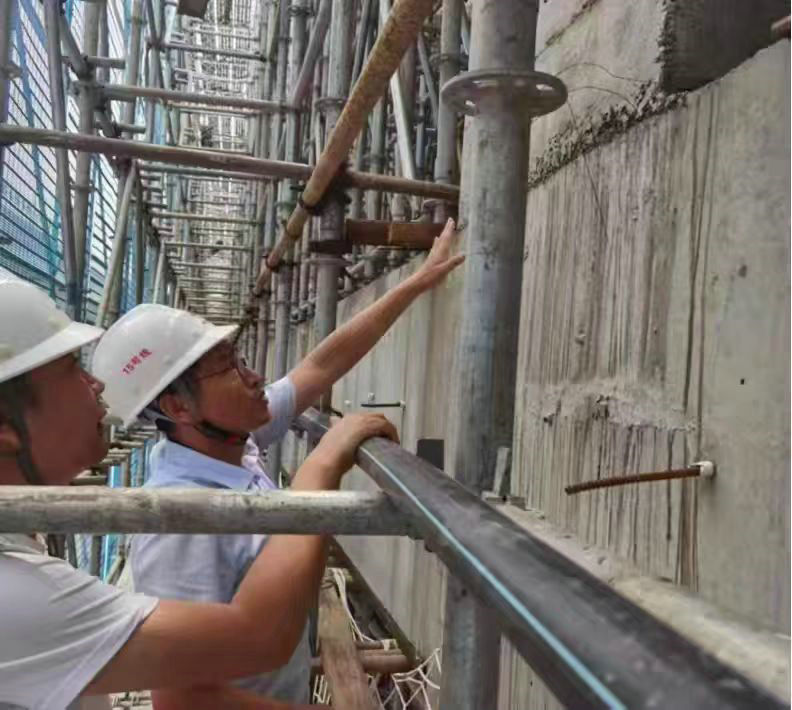 總承包部副指揮長兼總工程師楊振(右)在現(xiàn)場質量檢查
