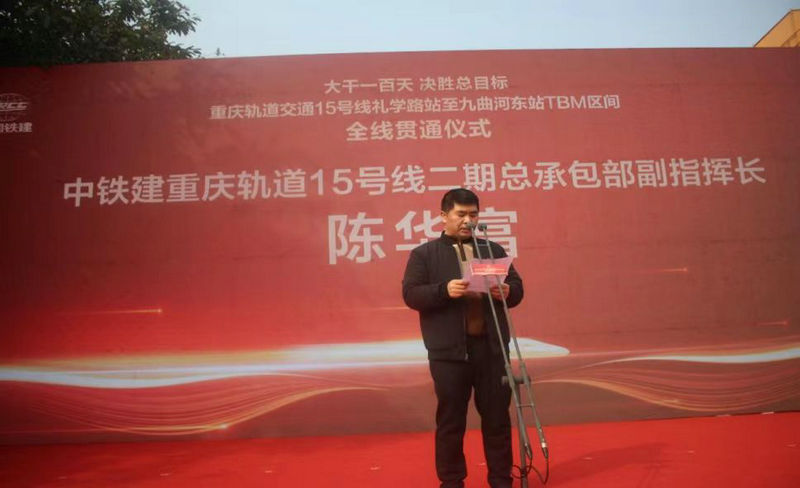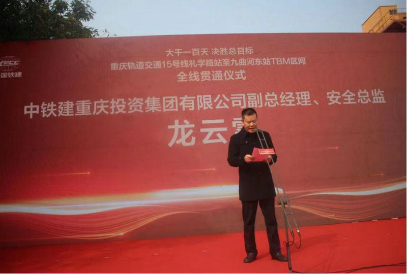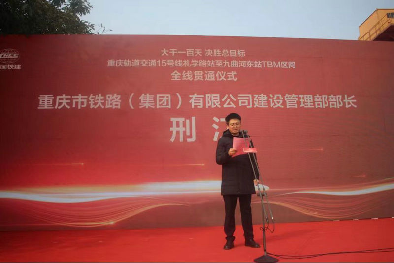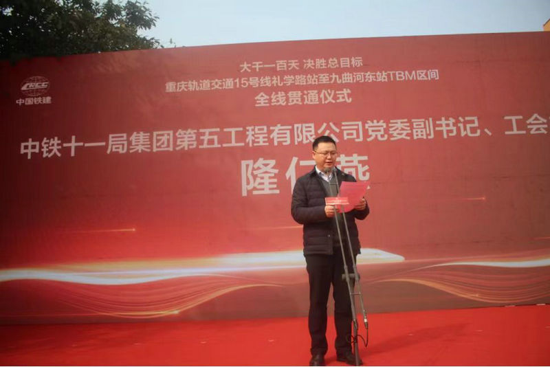 重慶市鐵路集團(tuán)建設(shè)管理部部長(zhǎng)邢江講話(huà)、宣布禮學(xué)路站至九曲河?xùn)|站TBM區(qū)間全線(xiàn)貫通