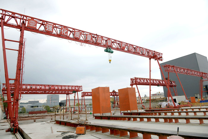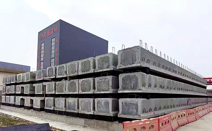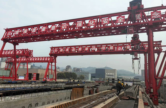 制梁場為滿足招賢、閣底、天馬、白虎灘樞紐泄洪閘與富足山、徐村等4座大橋架梁而設(shè),緊鄰白虎灘樞紐拌合中心與鋼筋加工大棚,占地7320平方米。該梁場設(shè)施一應(yīng)俱全,具備生產(chǎn)、存儲、轉(zhuǎn)運、防排水、電力、消防、空心板梁和T梁預(yù)制梁、存梁、預(yù)應(yīng)力材料和廢料存放等功能。左區(qū)長171米、右區(qū)長134米,寬各24米。梁區(qū)設(shè)有智能張拉機、真空壓漿機、6座龍門吊,以及噴淋養(yǎng)護系統(tǒng)、配電設(shè)備、視頻監(jiān)控和發(fā)電機等設(shè)備。4座樞紐和4座橋梁工程的梁有10多種規(guī)格,長13米—40米,分為空心板梁和T梁,共1356片,目前預(yù)制的是4座泄洪閘和招賢電站首橋所需的空心板梁。