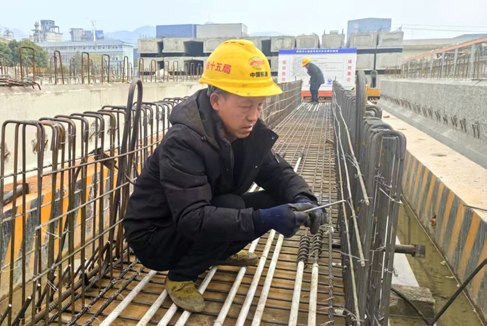 齊心協(xié)力完成上層一道鋼筋網(wǎng) 黃偉攝