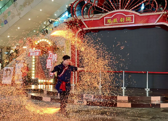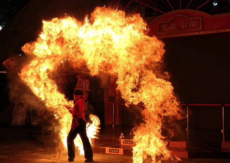 活動現(xiàn)場包含了新春特別版節(jié)目演繹和非遺火舞表演。火棒、火棍、火流星、鐵飛花等精彩演出在夜空中劃出優(yōu)美的弧線,舞者們矯健的身姿與火焰完美融合,給游客帶來了視覺與文化的雙重震撼,現(xiàn)場游客紛紛拿出手機拍照打卡,記錄了這難忘的瞬間。