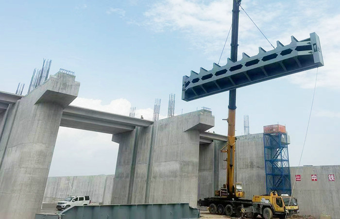為了高效、安全、優(yōu)質(zhì)地完成泄洪閘閘門施工任務(wù),該項(xiàng)目部擇優(yōu)選用國(guó)內(nèi)一家閘門生產(chǎn)廠家定制一扇扇40多噸重的大閘門,并對(duì)運(yùn)輸、起吊等全過(guò)程采取切實(shí)可行的安全防護(hù)措施,并選擇300噸的汽車吊進(jìn)行吊裝。經(jīng)過(guò)精心準(zhǔn)備,第一扇厚重的大鐵門安裝到位。