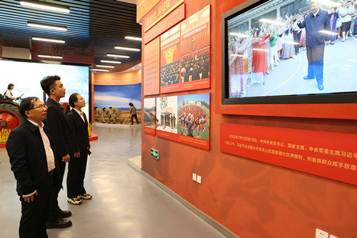 在講解員的帶領(lǐng)下,全體人員參觀了“軍墾之星”數(shù)創(chuàng)基地北大廳兵團(tuán)紅色文化等展區(qū),通過(guò)借助文物、圖片、展板、多媒體屏幕等媒介,用動(dòng)畫話兵團(tuán)、沙畫繪兵團(tuán)、電影講兵團(tuán)、紀(jì)錄片述兵團(tuán)了解歷史文物蘊(yùn)含的兵團(tuán)精神,感受老一輩兵團(tuán)人屯墾戍邊的崢嶸歲月。