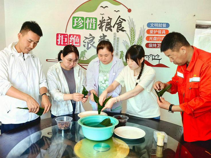“大家快來參加活動,一起包粽子,今天的游戲環(huán)節(jié)豐富多彩,樂趣多多……”一片片清香的粽葉、一粒粒飽滿的糯米、一顆顆晶瑩剔透的蜜棗、一條條五彩的麻繩……在活動開始前,包粽子的材料已整整齊齊擺放在活動會場的桌子上,幾位經(jīng)驗豐富的職工率先示范包粽子的技巧,從折疊粽葉、填充糯米到系繩固定,每一個步驟都講解得細(xì)致入微?,F(xiàn)場氣氛愈發(fā)濃烈大家當(dāng)即分成小組,一邊相互交流學(xué)習(xí),一邊動手實踐。大家不僅掌握了基本技巧,還包出了一個個形狀各異、充滿創(chuàng)意的粽子,現(xiàn)場笑聲不斷,其樂融融,并將粽子煮熟一同分享勞動成果。