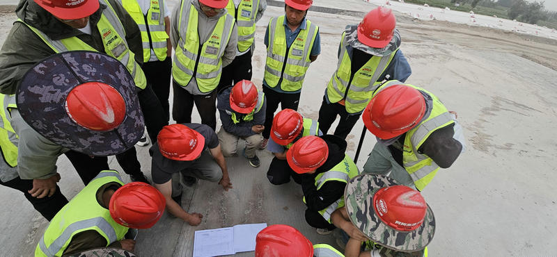 理論沉一線,破解技術(shù)堵點(diǎn)。項(xiàng)目將課堂搬到施工前沿,開展“圖紙+現(xiàn)場(chǎng)+問題”三位一體教學(xué)。在橋涵過渡段,技術(shù)負(fù)責(zé)人演示“壓實(shí)度分層測(cè)控法”,精準(zhǔn)控制攤鋪與碾壓參數(shù),消除“橋頭跳車”隱患;路面作業(yè)區(qū)里,技術(shù)人員邊學(xué)水穩(wěn)層配比理論,邊實(shí)操攤鋪校準(zhǔn)與碾壓調(diào)試,掌握“毫米級(jí)”精度;塔里木河特大橋現(xiàn)場(chǎng),技術(shù)人員認(rèn)真記錄要點(diǎn),形成“學(xué)、看、解”閉環(huán)。