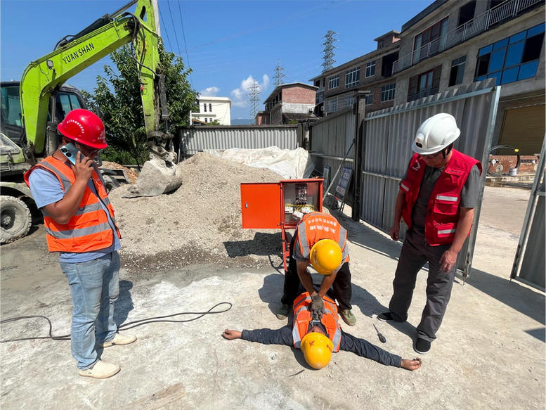 演練現(xiàn)場模擬了工人在進行充電樁電纜敷設作業(yè)時,因電纜外皮老化破損,不慎觸電倒地的緊急情況。事故發(fā)生瞬間,現(xiàn)場安全員迅速反應,一邊高喊“別靠近,危險!”,一邊抄起絕緣橡膠棒,僅用10秒就挑開了纏繞在傷者身上的帶電電纜,隨即切斷總電源,并通過對講機向項目部報告:“A區(qū)配電房有人觸電,已斷電,請求支援!”