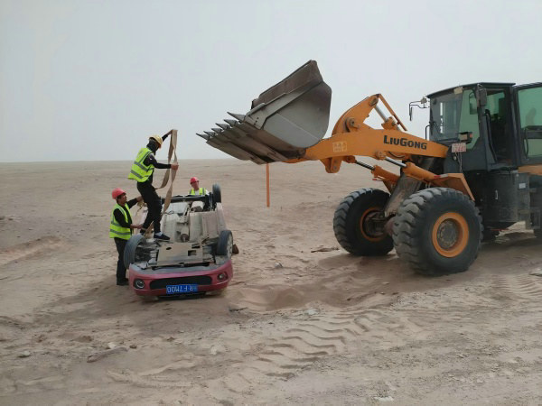 項(xiàng)目安全負(fù)責(zé)人王明海,迅速指揮調(diào)配附近的機(jī)械班組開來一臺裝載機(jī)。裝載機(jī)龐大的身軀在沙漠中如同一頭鋼鐵巨獸,沉穩(wěn)而有力。他一邊安撫傾翻車輛駕駛員的情緒,說到:“別慌,有我們在!”一邊和同伴熟練地將牽引帶固定在車輛上并時(shí)刻專注地檢查固定情況,確保每一個(gè)環(huán)節(jié)都不出差錯(cuò)。酷熱的荒漠中他們的眼神中透著堅(jiān)定與果敢,汗水順著臉頰滑落,浸濕了領(lǐng)口,卻絲毫沒有影響他們救援的動作。