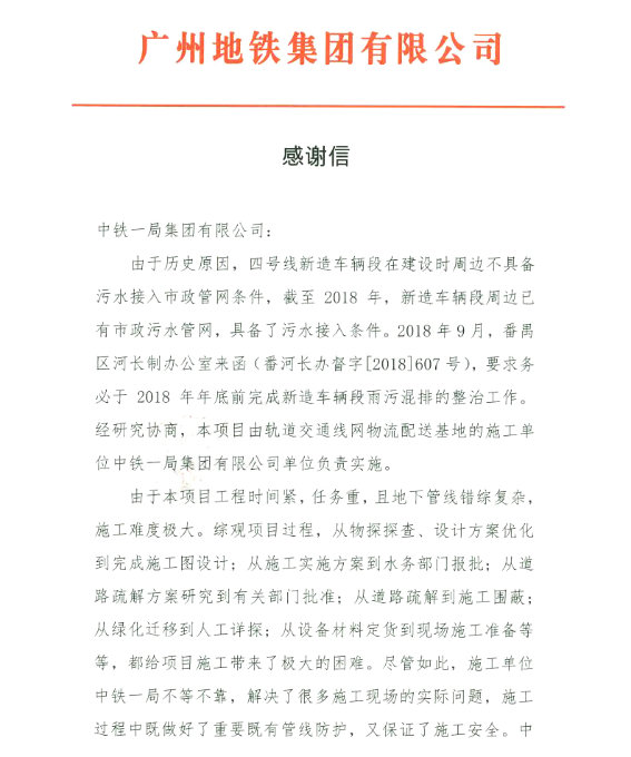?。◤V州訊)4月10日,廣州地鐵集團(tuán)向中鐵一局集團(tuán)發(fā)來(lái)感謝信,就中鐵一局建安公司參建員工在廣州地鐵4號(hào)線新造車(chē)輛段雨污混排整治工作中所表現(xiàn)出的強(qiáng)烈責(zé)任感和大局意識(shí),以及在施工過(guò)程中所展現(xiàn)的攻堅(jiān)克難能力提出表?yè)P(yáng),對(duì)全體參建員工按時(shí)按質(zhì)安全完成施工任務(wù)表示感謝! 廣州地鐵4號(hào)線新造車(chē)輛段建設(shè)之初,周邊尚不具備污水接入市政管網(wǎng)條件。2018年9月接入條件成熟后,廣州市番禹區(qū)河長(zhǎng)制辦公室要求2018年年底前必須完成車(chē)輛段雨污混排整治工作。 2018年9月,擔(dān)負(fù)廣州軌道交通線網(wǎng)物流配送基地施工任務(wù)的中鐵一局建安公司接到了廣州地鐵集團(tuán)下達(dá)的施工任務(wù),全力以赴,確保在年底前實(shí)現(xiàn)車(chē)輛段雨污混排管道接入市政管網(wǎng)。 “這是一項(xiàng)環(huán)保工程,更是一項(xiàng)政治工程。”接到施工任務(wù)后,建安公司迅速組織精干人員跑步進(jìn)場(chǎng)。當(dāng)時(shí),前期的勘測(cè)、設(shè)計(jì)工作尚未完成,工程施工無(wú)法展開(kāi)。面對(duì)困境,全體參建人員表現(xiàn)出了高度的大局意識(shí)和責(zé)任意識(shí),通過(guò)抽調(diào)人員、設(shè)備參與人工詳探等形式,全力配合勘測(cè)、設(shè)計(jì)工作的開(kāi)展。 工程開(kāi)工后,面對(duì)工期緊,任務(wù)重的嚴(yán)峻形式,項(xiàng)目管理團(tuán)隊(duì)精心組織生產(chǎn)、科學(xué)安排施工,克服了地下管線雜,交通疏解難,綠化遷移多等困難,通過(guò)倒排工期、合理組織交叉施工,采用人工開(kāi)挖敷設(shè)排污管道等措施,全力以赴的搶抓施工進(jìn)度。在此期間,項(xiàng)目管理團(tuán)隊(duì)安全跨越跨越兩條高壓線、三條通訊光纖以及一條大口徑自來(lái)水供水管道,并于2018年12月份按時(shí)按質(zhì)完成施工任務(wù),并投入正常使用,得到了相關(guān)單位的一致好評(píng)!