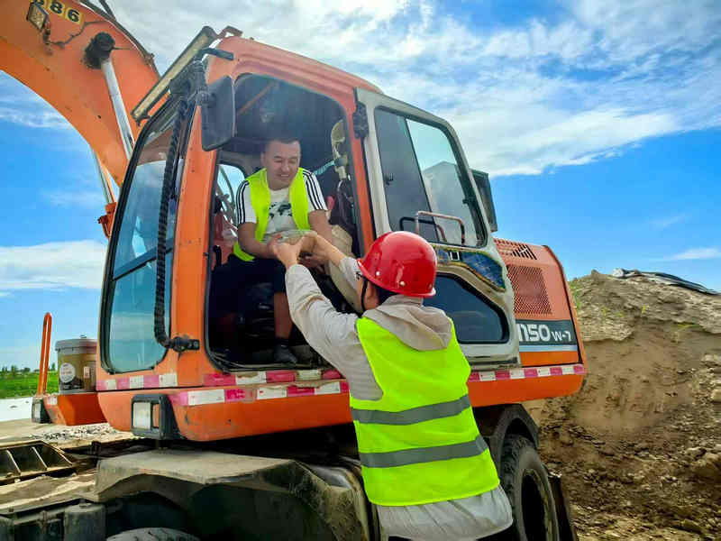 該項(xiàng)目部前往施工現(xiàn)場(chǎng)為各施工隊(duì)伍發(fā)放了西瓜、綠豆湯、礦泉水、藿香正氣液等夏季防暑降溫物品,對(duì)高溫天氣下辛勞工作的一線工人表達(dá)了親切的慰問(wèn)和衷心的感謝,并提醒工友們?cè)诟邷靥鞖庀伦⒁庾龊梅朗罱禍卮胧D玫椒朗钗镔Y的工友們紛紛表示:“項(xiàng)目部送的清涼用品,看著貼心,用著暖心!這份關(guān)懷極大鼓舞了我們,讓大家心里暖暖的,也給了我們戰(zhàn)勝高溫酷暑的信心,再熱的天干活也更有勁兒!”