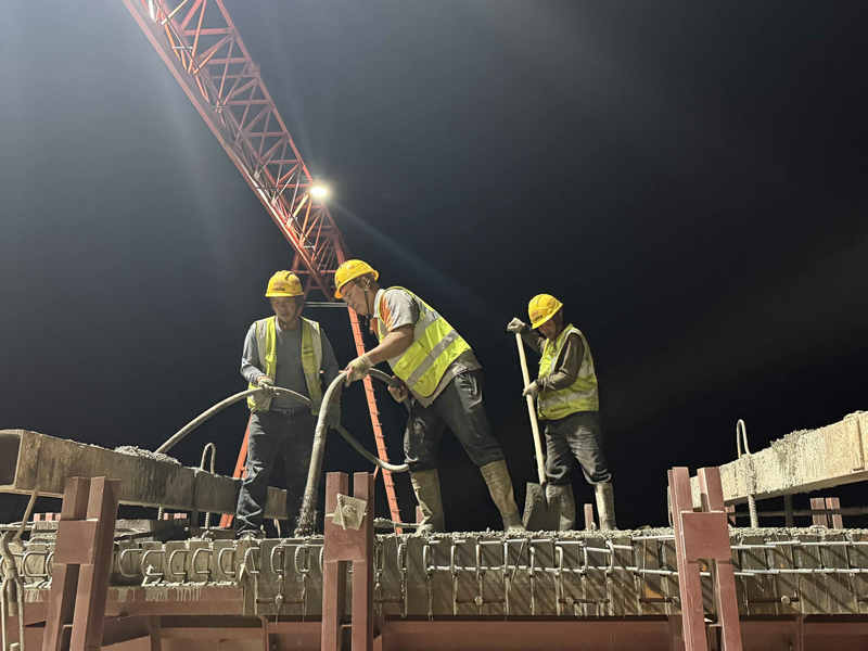在施工過程中,項目團隊為了確?;炷镣庥^及強度達標,運用了整體鋼模、附著式聯(lián)合振搗以及“棉被溫室+噴淋”養(yǎng)護體系。同時,項目部嚴格執(zhí)行“首件制”管理,施工前組織了方案評審,對鋼筋下料、模板拼裝、張拉壓漿等關鍵工序進行了詳細交底,而且作業(yè)人員都通過了技能考核。現(xiàn)場還配備了夜間照明、車輛指揮、防暑降溫等措施,保障了安全、質(zhì)量、進度同步受控。?