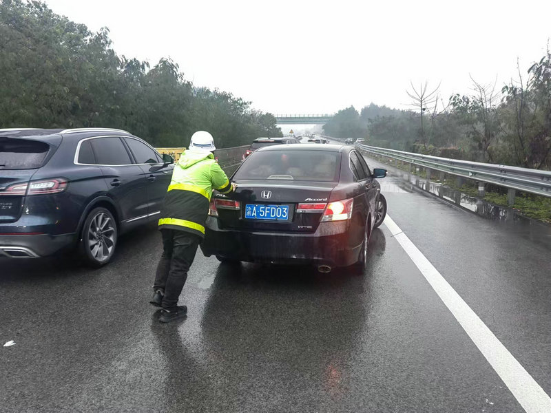 2025年1月31春節(jié)小長假第四天上午,渝長復線高速在車流量高于日常的基礎上,出城方向長梁互通車流量逐漸增加,擁堵路段約1.3公里。監(jiān)控員雷懿將此情況告知路巡隊員,并密切關注該路段車流量情況,當班巡查隊員包安泰和楊洋得知情況后,立即前往長梁互通駐點。當巡查到該路段附近時,看見一輛黑色小車占第二車道停放。根據(jù)多年巡查工作經驗,包安泰和楊洋認識到該車輛屬于故障車輛,隨即立刻上前詢問后得知,該車輛確實需要救援。面對逐漸增加的車流量,該車占道會導致后方積壓車輛越來越多,在與車方溝通確定后,兩人將車輛推移至應急車道上,等待救援車輛,及時化解了該路段的擁堵狀況。