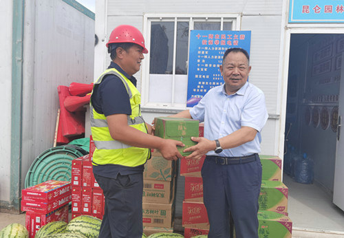 烏魯木齊訊(通訊員 趙泉友)盛夏時(shí)節(jié),熱浪襲人,高溫天氣給一線職工帶來(lái)嚴(yán)峻考驗(yàn)。7月30日,建咨集團(tuán)黨委書(shū)記、董事長(zhǎng)鄧如才,赴昆侖園林公司承接的金風(fēng)科技白鳥(niǎo)湖創(chuàng)新中心項(xiàng)目二期三期景觀綠化工程項(xiàng)目,為在高溫中堅(jiān)守崗位的職工們送去夏日的清涼與慰問(wèn)。
