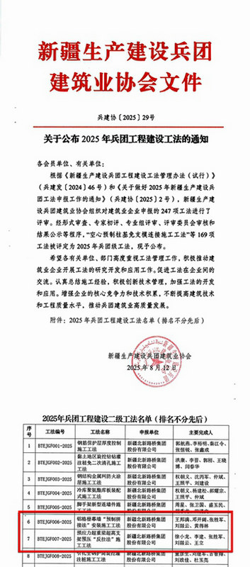 南平訊(通訊員 王立、王邦滿(mǎn))近日,新疆生產(chǎn)建設(shè)兵團(tuán)建筑業(yè)協(xié)會(huì)公布2025年度兵團(tuán)級(jí)(省部級(jí))工法成果,北新路橋集團(tuán)福建分公司2項(xiàng)工法成功入選,至此該分公司本年度已累計(jì)有3項(xiàng)工法獲得省部級(jí)認(rèn)證。