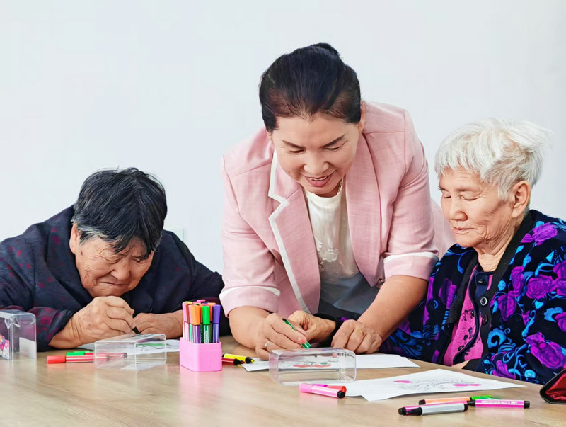 圖2為:六師奇臺110社區(qū)吾家樂寶養(yǎng)老院的“老寶貝”們,正在專心畫畫。
