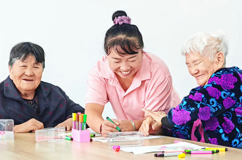 圖5為:六師奇臺110社區(qū)吾家樂寶養(yǎng)老院護理員張遠英(左一),同可愛的老奶奶們有說有笑,一起畫畫。