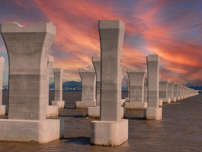 中鐵十五局承建的濱海高架、濱海樞紐互通位于寧波市鎮(zhèn)海區(qū)淺海水域,全長14.6公里,樁基1739根、承臺348座、橋墩812座。其中濱海樞紐互通全長9705米,是亞洲最大的海上樞紐互通。